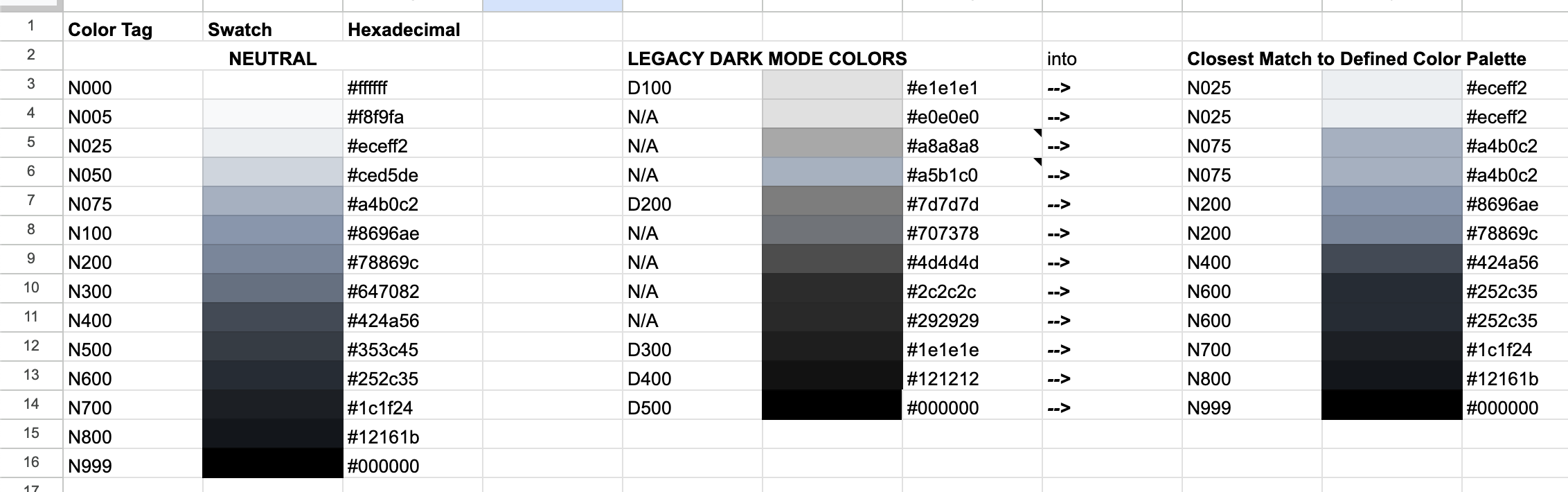 Left: The newly defined Neutral palette. Middle: Colors I found used in Dark Mode that would be retired. Right: Guide on which of those colors correspond to the new one.