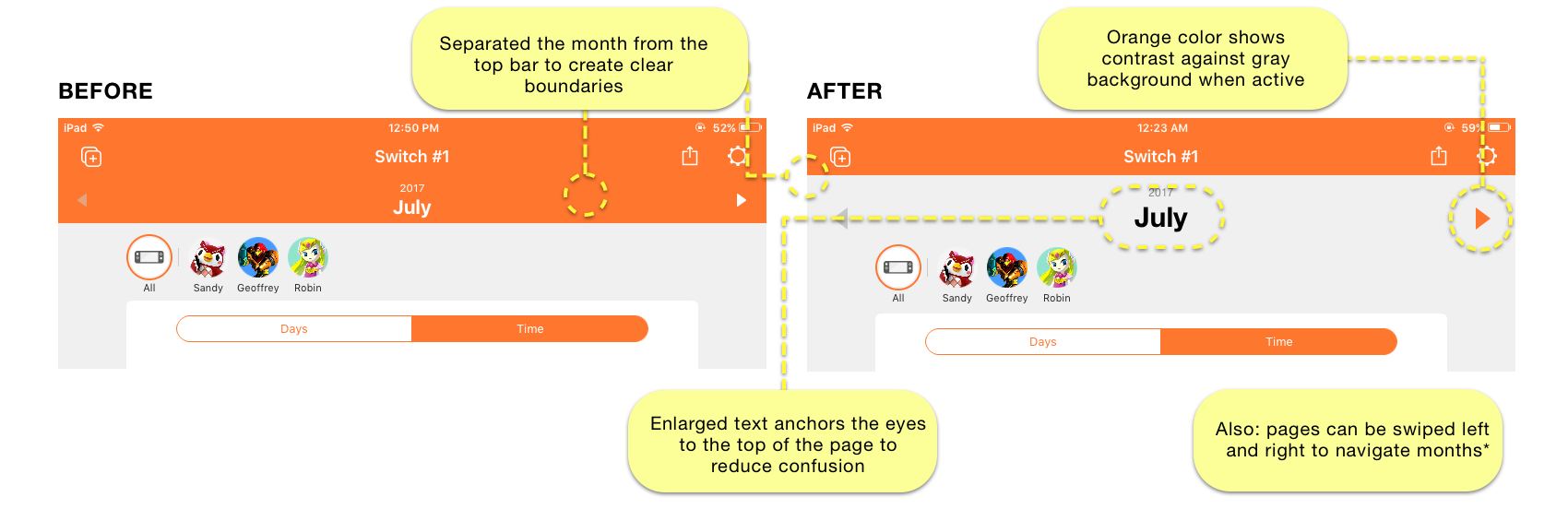 Though online reviews gave me an idea of what to test for, in-person user testing revealed a surprise: Users simply did not easily understand what month they were looking at when browsing their history iPad.